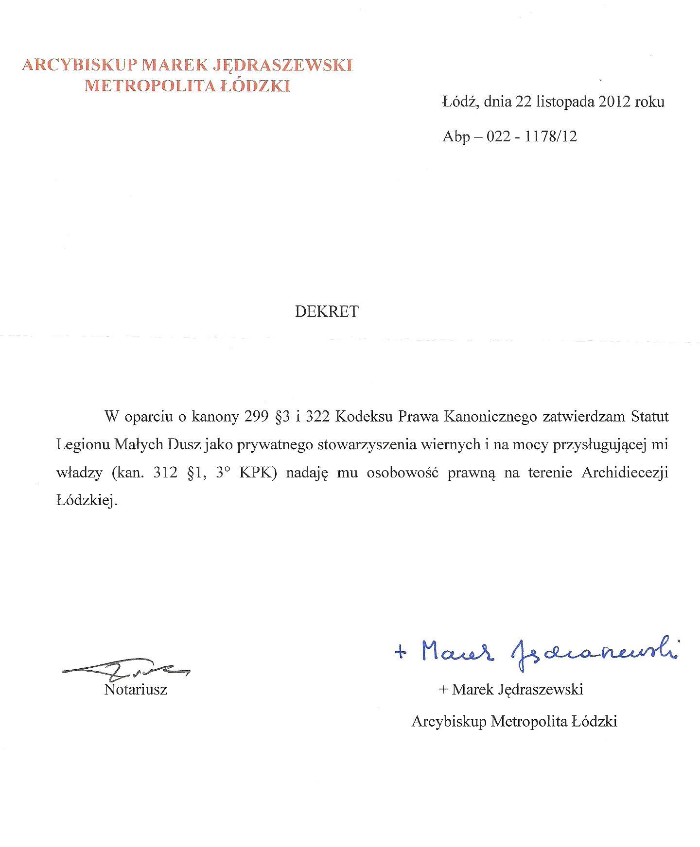 Stowarzyszenie Legion Małych Dusz posiada osobowość prawną. Postanowieniem Sądu z dnia 14.01.2011r. Legion został wpisany do Krajowego Rejestru Sądowego.